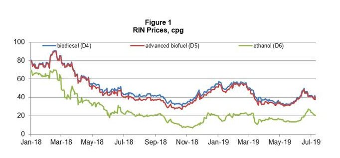 RIN prices shown in the figure below also show a flat-line course as of late. RIN prices constantly decreased in 2018 until mid-November. In 2019, there have been some gradual increases and decreases and some flat-line trends. Current biodiesel and ethanol RINs are in the 35-40 cpg and 15-20 cpg range, respectively.