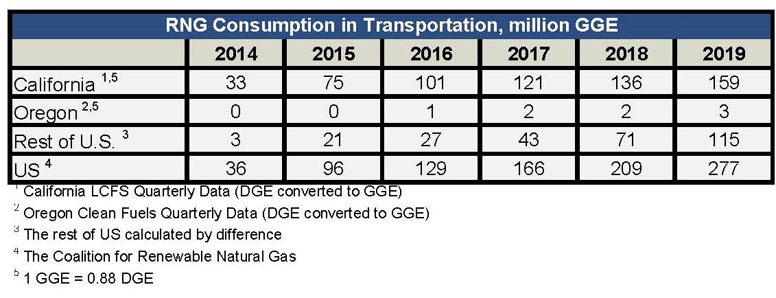On July 2, 2014, the EPA finalized amendments to the RFS program qualifying additional pathways that could be used in producing renewable fuel. Compressed natural gas (R-CNG) and liquefied natural gas (R-LNG) produced using biogas from landfills, municipal wastewater treatment facility digesters, agricultural digesters, and separated MSW digesters would qualify as cellulosic and advanced fuel pathways. Electricity produced using biogas from these feed sources was also granted a pathway, provided the power is used in electric vehicles. In mid-2014, renewable CNG and LNG became popular transportation fuels and producers of D3 RINs. This was because they now qualified for a D3 RIN. Currently, renewable CNG and LNG make up over 99% of Cellulosic (D3/D7) RIN generation. This renewable natural gas (RNG) transportation fuel growth is shown in Figure 1. Table 1 shows the U.S. breakdown of RNG used in transportation fuel.