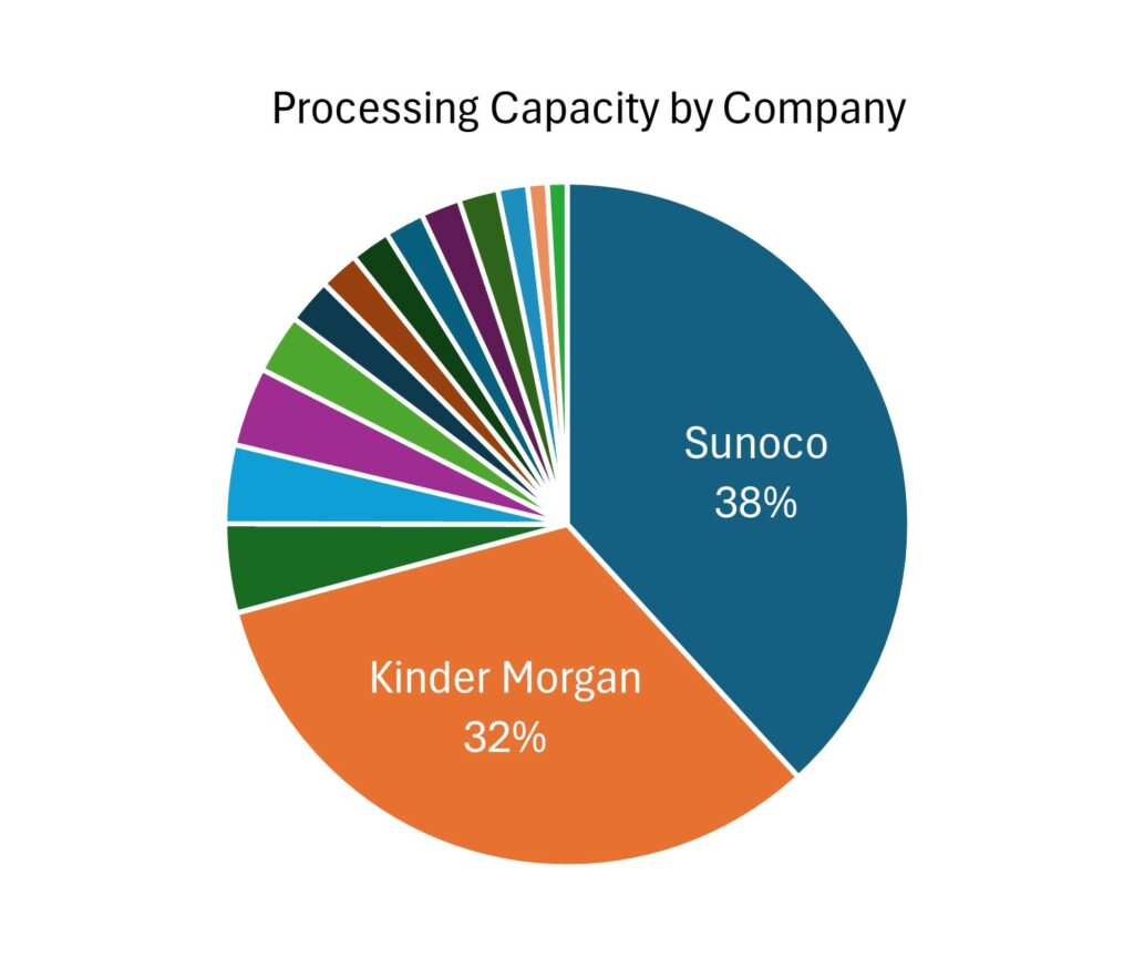 The market is dominated by Sunoco and Kinder Morgan, who make up almost 80% of the processing capacity across 10 different facilities.
