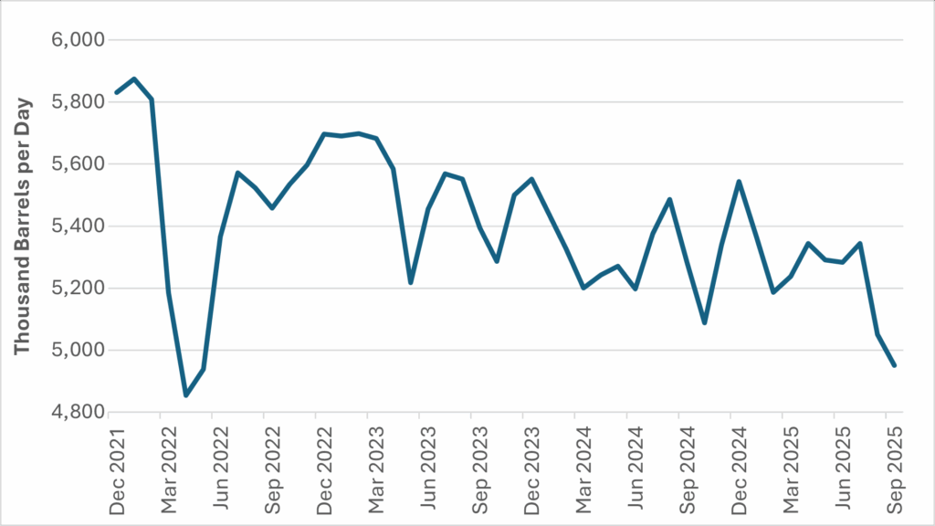 Since July, multiple high-capacity refineries—including Ryazan, Kirishi, Nizhny Novgorod, Volgograd, and Saratov—have suffered damage from drone strikes, some on multiple occasions. September refining runs averaged almost 600 MPBD less than in December 2024. Russia’s refining throughput fell below 5 million barrels per day, the lowest level since mid-2022.